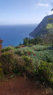 Um lindo jardim de flores perto do Nordeste, com vista para as falésias montanhosas que se elevam sobre o mar.